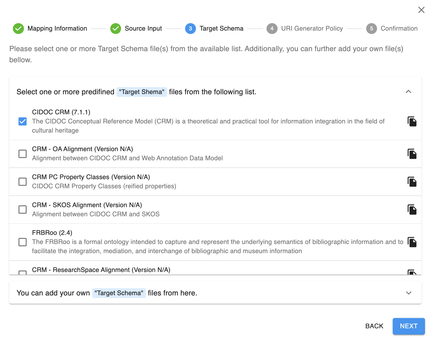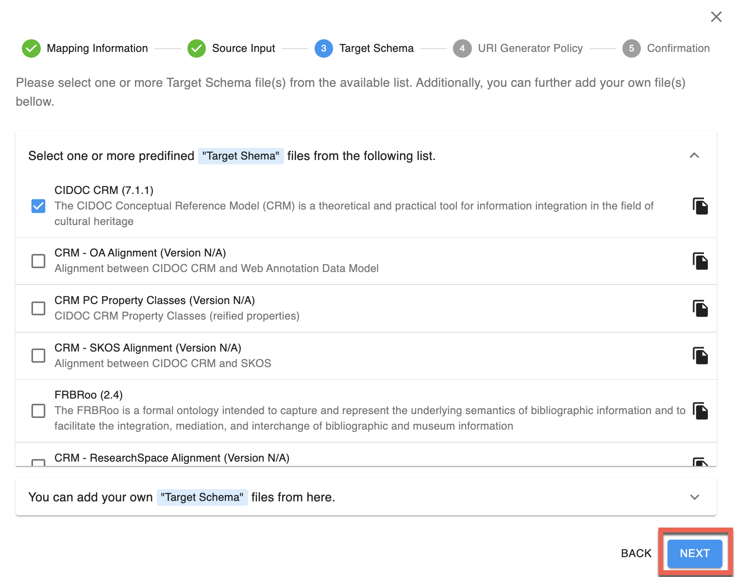 | L'étape Target Schema avec l'option CIDOC CRM (7.1.1) sélectionnée. |