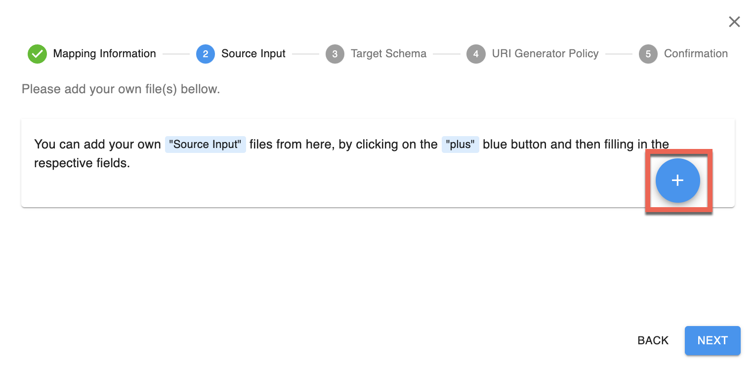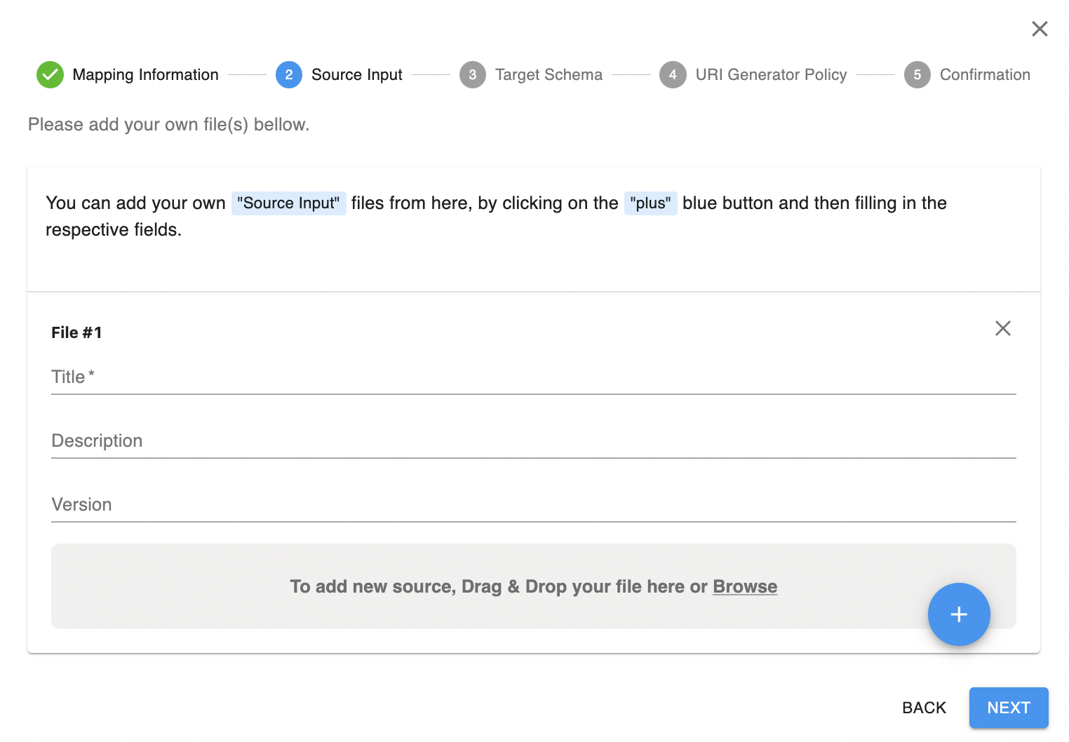- Cliquez sur Ajouter un nouveau fichier (bouton plus). Cela créera un panneau vide pour télécharger votre fichier d'entrée source.
